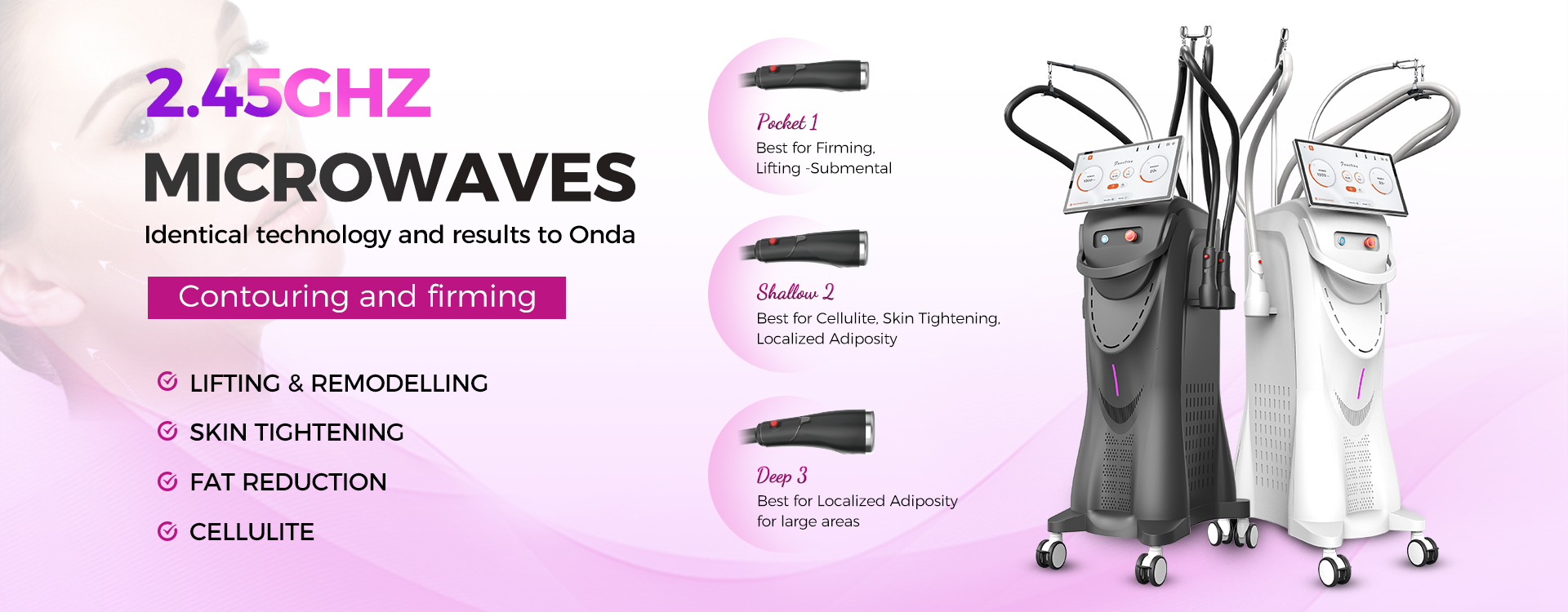 Technology: Microwave & Coolingwave Frequency: 2.45GHz Energy: 800W Depth: 3mm / 7mm / 15mm Cooling: 5°C – 20°C adjustable Interface: 12.1-inch capacitive touch screen Handpieces: Deep / Shallow / Pocket Power Supply: AC 100–240V 50/60Hz Port: Beijing Certification: CE, FDA,ISO13485 Warranty: 1 year
